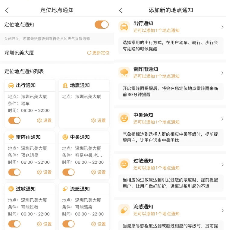 针对用户的健康需求,过敏通知、流感通知支持选择提醒等级,帮助用户及时观察周围环境,提前提醒用户进行防护;中暑通知可选择提醒人群和提醒等级,方便用户更有针对性地进行预防。在呈现上,用户可在同一定位地点开启出行、地震、雷阵雨、中暑、流感、过敏等多项通知,只需一次设置,即可解决多项生活服务提醒问题。