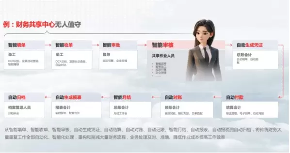 在数智商业体中,数智员工是无处不在的,他们可以是税务风险合规官,是客服助理,是合同审核助理,也可以是采购合规官。比如,在无人值守的财务共享中心,数智员工可将大量重复的工作包揽下来,帮助企业完成智能填单、智能审核、自动生成凭证、自动结算、自动归档等全过程,从而简化大量财务流程,让财务的工作提质、降本、增效。