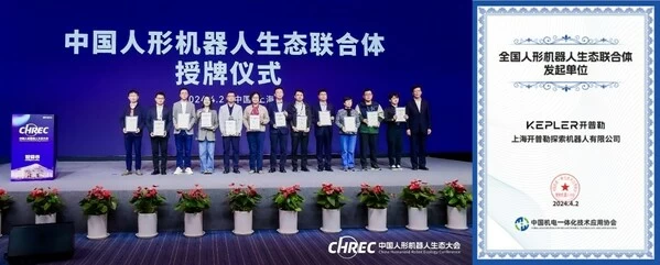 大会现场还举行了中国人形机器人生态联合体授牌仪式,该联合体由整机、用户、高校与产业链上下游单位发起组件,将整合"政、产、学、研、用、金、服"等各界的资源优势,共同推进人形机器人应用拓展,培育人形机器人发展和应用生态,推进我国人形机器人产业自立自强,加快建设制造强国、数字中国。开普勒人形机器人作为发起单位之一,现场获颁联合体发起单位证书。