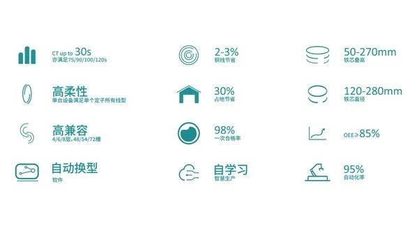 第二代扁线定子量产线具备高柔性化特征,采用模块化设计,50%的工艺站可快速自动换型,整线换型时间少于45分钟。同时,对PIN成型、去漆皮、自动编篮、自动插PIN、焊接等工艺站进行升级迭代,从而实现整线OEE和自动化率的大幅提升,生产节拍最快可达30s,满足了客户对高效率和高质量的双重需求。