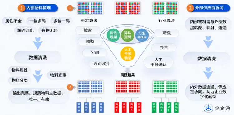 数据清洗增值服务:企企通打造的一套以AI模型和算法为核心的产品及服务,可针对各类企业的不同主数据痛点难点,提供多种解决方案,能够快速完成物料主数据清洗、识别、匹配、梳理,满足一物一码、分类梳理、一品多商、多维度比价、精准寻源选品、建立标准物料库、供应商及客户主数据清洗等业务场景需求。