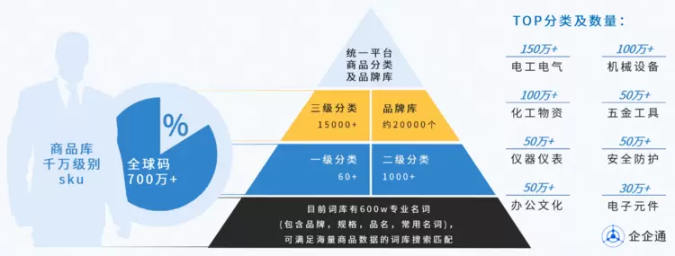 目前企企通对接了京东、天猫、工业超市、苏宁易购、鑫方盛等15+主流电商平台,平台上汇聚了商品SKU数量达千万级,其中60+一级大类,属性值100万+条,词库有600w专业名词,可满足海量商品数据的词库搜索匹配。企企通对自己的商品池进行了清洗,形成700万+全球码,同一个全球码下面可绑定多个不同商家的同品商品,这是企企通对自己商品管理能力的体现。