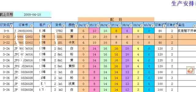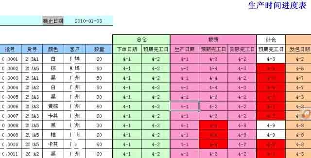 生产时间进度是企业生产经理非常希望看到的,生产下达后,自动会根据每双鞋子在各道工序所要的时间计算出各各订单预计在各道工序的完成进度,再由车间报告实际完成情况,实际完成日期与计划完成日期不同时进度表出现不同的颜色,下面出现红色的代表是延期完工的情况,生产经理很容易就可以对生产车间进行管理了。