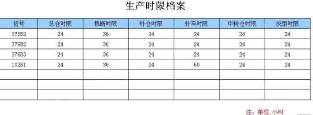为了实现上面的报表,必须为每双鞋子确定个在各道工序的时间,如375b2这双鞋在总仓的准备时间是24小时,在裁断的时间是36个小时,在针车仓是24小时,这个档案要先建立起来
