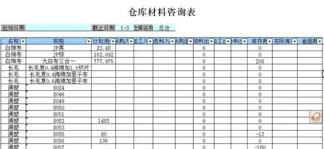 仓库咨询表非常重要,一打开这张表就可以自动各材料的库存情况、外加工情况、应该采购的情况及节超情况。