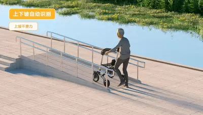 设定坡度智能识别,推行过程自动识别上下坡,实现上坡不费力,下坡不溜坡。同时,还有智能防跌功能,推行过程智能识别跌倒倾向,实现急停驻车,及时预防跌倒。