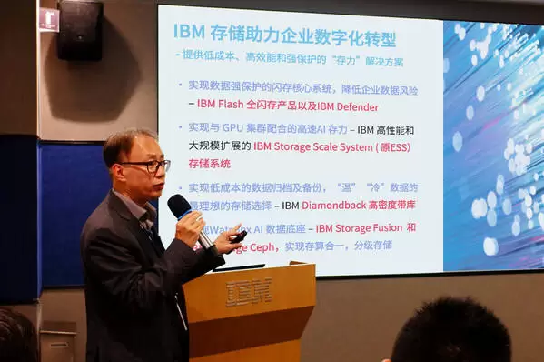 IBM大中华区存储业务总经理侯淼首先带来《IBM存储,通过提供低成本、高效能、新科技和强保护的优势,助力企业实现降本、增效、新质、安全的数字化转型》专题分享。在"数字化转型"和"人工智能+"驱动下,企业面临海量数据和异构IT环境带来的挑战,对此IBM存储基于旗下闪存、AI存储、带库及watsonx存储,给出了从边缘到核心、再到云端,打通高效数据管道的解决方案。