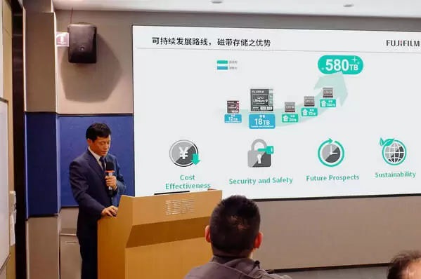 施泽民博士还从技术角度具体介绍了富士胶片数据流磁带的优势。依靠公司在胶卷研制中积累的纳米涂层技术以及钡铁氧体磁性颗粒实现了单盘高数据存储、易读写、低摩擦、高密度的技术优势,该系列产品占据全球磁带市场约75%的生产和销售份额。目前系列最新一代产品LTO9拥有单盘18TB的大容量、400M/S传输速率,并且仍然保有技术迭代空间,如此前富士胶片与IBM公布了共同研发出单盘容量580TB的数据流磁带,为用户更具长远视角的设备投资、以及磁带生态整体的可持续发展提供技术保障。