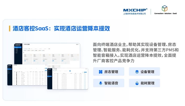 庆科信息面向终端酒店业主提供了酒店客控SaaS,帮助酒店业主实现设备管理、房态管理、智能服务、能耗优化等运营管理场景,并支持第三方PMS和智能音箱接入。可视运营,简洁易用,实现酒店运营降本提效,全面提升厂商客控产品竞争力。