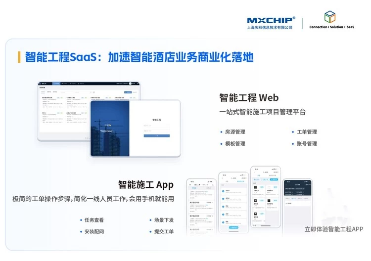 庆科信息推出的高品质智能硬件方案,让无线替代有线,满足厂商产品智能化升级需求。智能工程SaaS加速厂商产品落地,酒店客控SaaS提升服务品质,为酒店客人提供更加个性化和舒适的入住体验,而在运维方面,庆科信息的厂商SaaS则为酒店提供了更便捷、高效的设备维护和管理手段,实现设备持久运维、用户持续服务、场景持续运营。