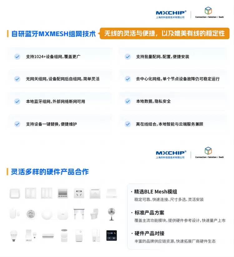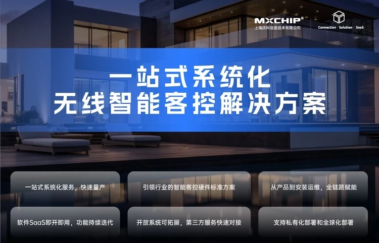 在硬件配置上,庆科信息自研的MXMESH组网技术基于标准蓝牙Mesh实现了全面的能力升级,可以构建去中心化的本地智能网络,支持大规模快速部署、楼宇级稳定性、数据安全可靠、响应敏捷,轻松实现离在线结合。基于MXMESH,庆科信息推出了一站式智慧酒店客控硬件方案,丰富的产品矩阵覆盖了智能调光、智能控制、安放传感、环境控制等核心品类,方案本地智能及云端控制结合。