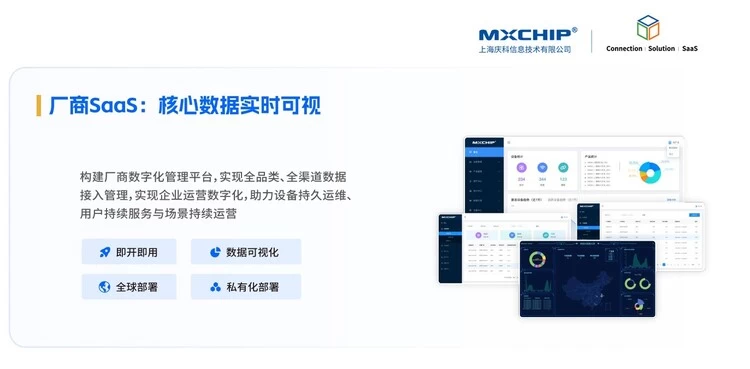 为了帮助厂商实现设备持久运维、用户持续服务、场景持续运营,庆科信息推出了面向厂商的SaaS服务,即开即用,让数据可视化,并支持全球化部署、私有化部署。