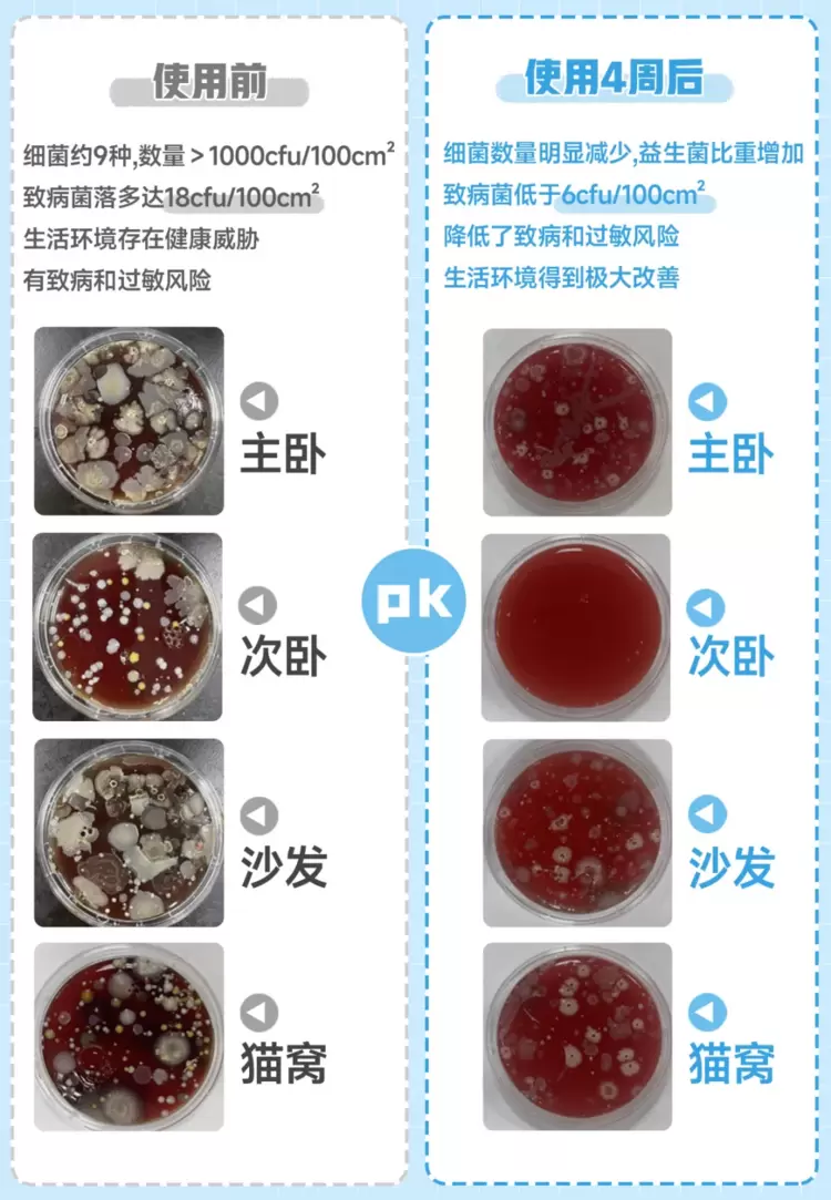 通过这次深度居家环境检测,可以充分证明悦呼吸全净器每次喷洒的环境益生菌在改善养宠家庭生活环境方面的强大实力。