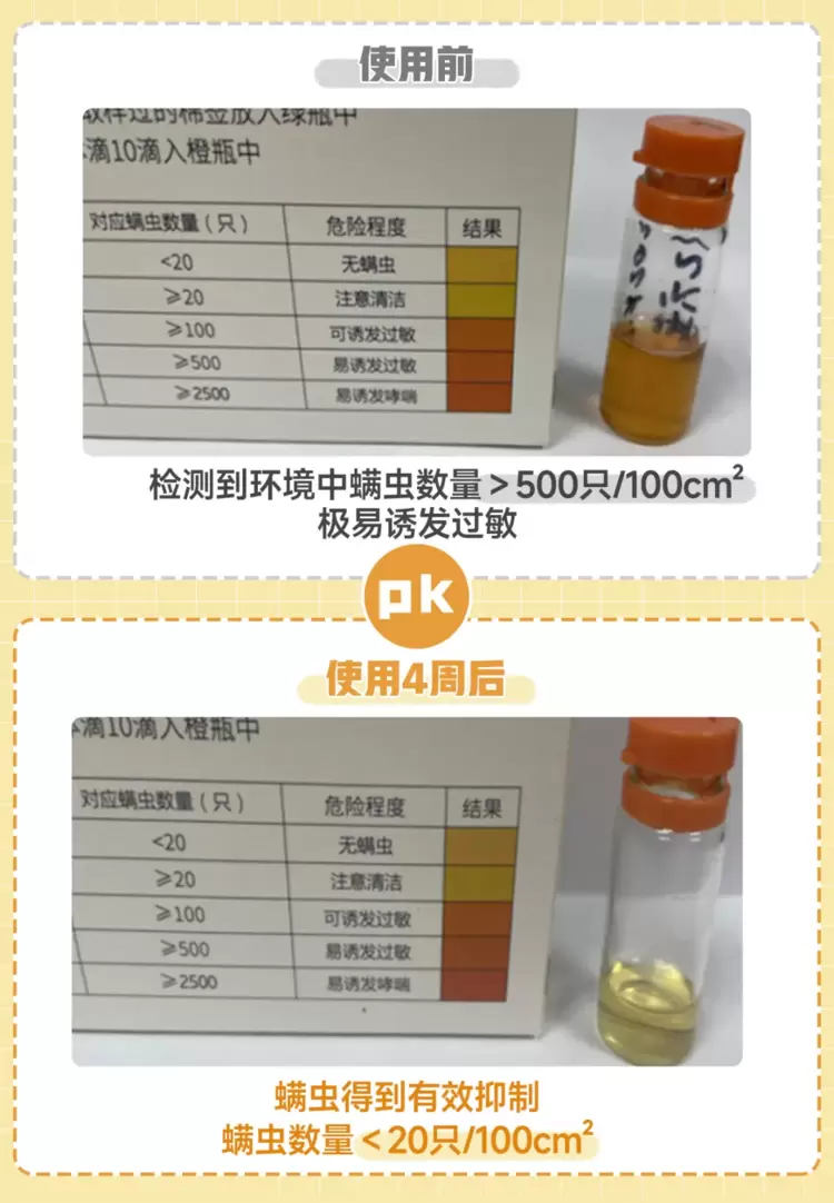螨虫数量也得到了有效控制,从每一百平方厘米螨虫数量超过500只,降到每一百平方厘米20只以下,从根源降低了过敏风险。