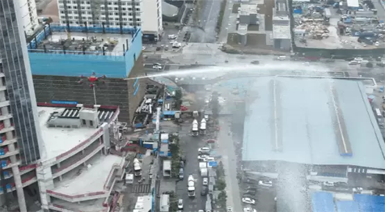 在作业阶段,此次测试灭火高度 100 米,现场风力较大且伴随中小雨,TS-X12 型系留无人机挂载专用喷射装置携水带迅速升空至测试位置,随后完成了 2 分 50 秒持续喷射灭火作业测试,水压为 0.93MPA,混合液流量为 133L/min(等效 CAF 流量为 800/min),水平喷射距离达 26 米,喷射路径良好,飞行姿态稳定。