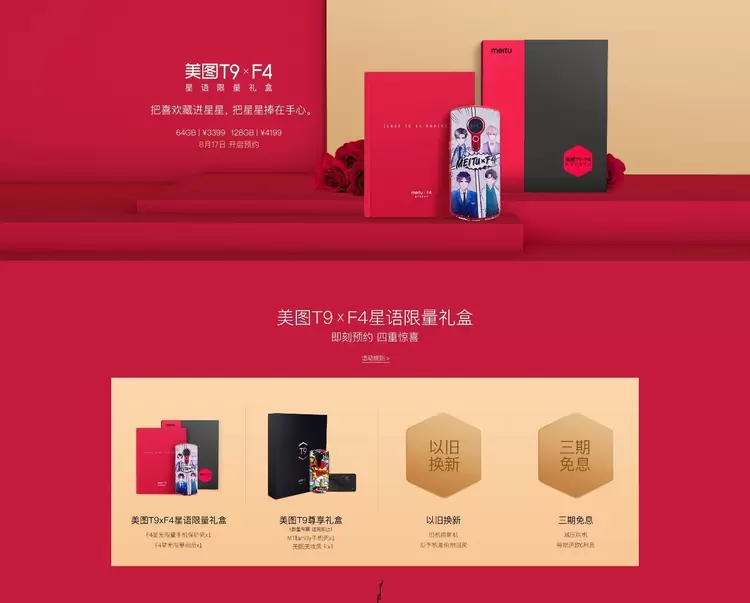8月17日是中国传统节日“七夕节”,同日,美图手机官方也联手新增代言人“F4”组合,推出“美图T9×F4星语限量礼盒”,内含美图T9手机,官方授权“F4星光限量画册”和“F4星光限量手机保护壳”,售价3399元(64GB)/4199元(128GB),与美图T9标准版同价。
