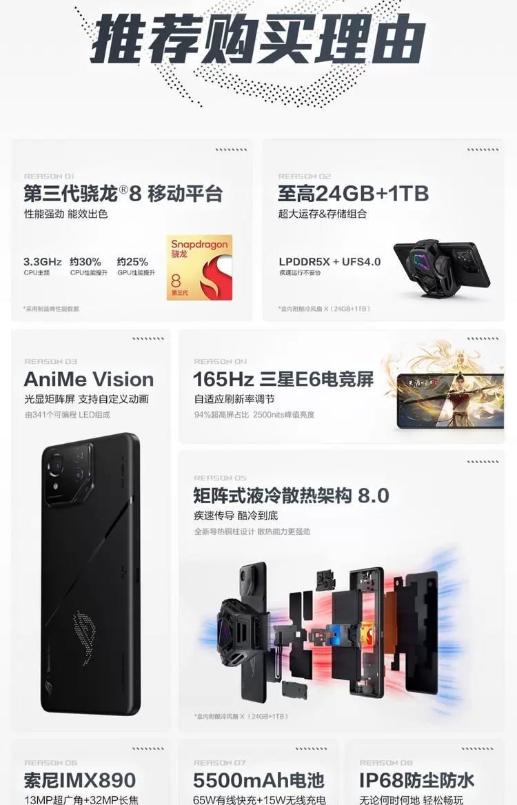ROG 8 Pro本身搭载了骁龙8 Gen3+ LPDDR5X 8533MHz内存+UFS 4.0规格闪存,在做到极致性能释放的同时,将功耗和发热控制做到了极致,整部手机作为一款硬核的游戏手机,拥有强劲性能、散热和充电体验。同时,他还首次搭载了IP68级防水防尘、无线充电和长焦镜头,提升日常实用性,是一款全方位满足日常使用的旗舰机。