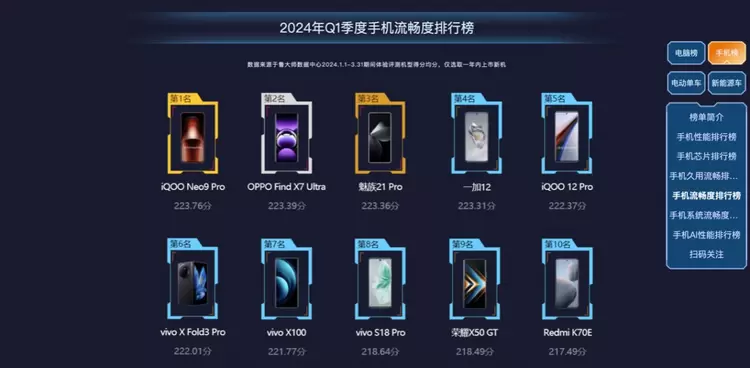其中,搭载了天玑9300以及OriginOS 4的iQOO Neo9 Pro以微弱的领先,取得了24年Q1季度的单机流畅排行冠军。紧随其后的则是今年OPPO的年度影像旗舰OPPO Find X7 Ultra,再然后是魅族21 Pro和一加 12。