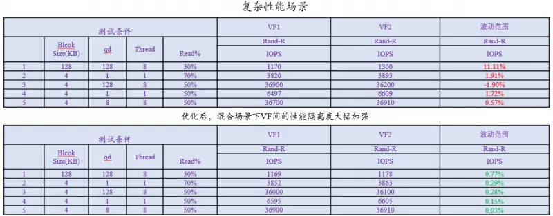 根据虚拟化场景需求,忆联在原SR-IOV功能的基础上进行了令牌桶调度优化,以达到资源的充分利用,将原来部分复杂业务场景下VF之间性能的相互影响从10%降低到5%以内。