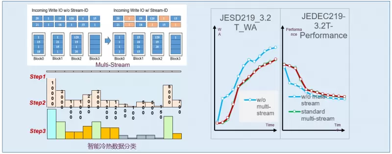 为了提高算力设施的效率和性能,忆联不断优化存储管理和数据访问方式。通过采用Multi-Stream技术和智能冷热数据分类算法,有效提高GC时的效率,减少了写放大,使得SSD的性能和寿命都能有较大提升。其中Multi-Stream主要满足云架构下的分布式存储场景,智能数据分类满足本地存储的需求(或特定业务Cluster)。
