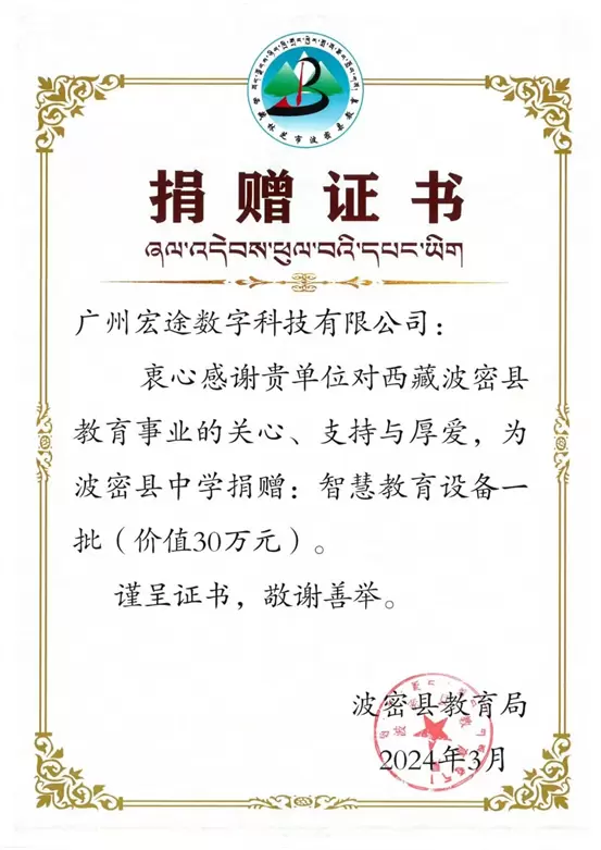 3月29日,广州宏途数字科技有限公司向波密县中学捐赠价值30万元的智慧教育设备,以期推动林芝市波密县教育事业的发展,提高波密县中学的教育教学水平,并于当日在波密县中学举行了捐赠仪式。值此广东省对口支援西藏自治区30周年之际,此次捐赠由广州市工信局引荐与推动,是广州市对口帮扶西藏自治区林芝市的援藏工作中又一重要进展。