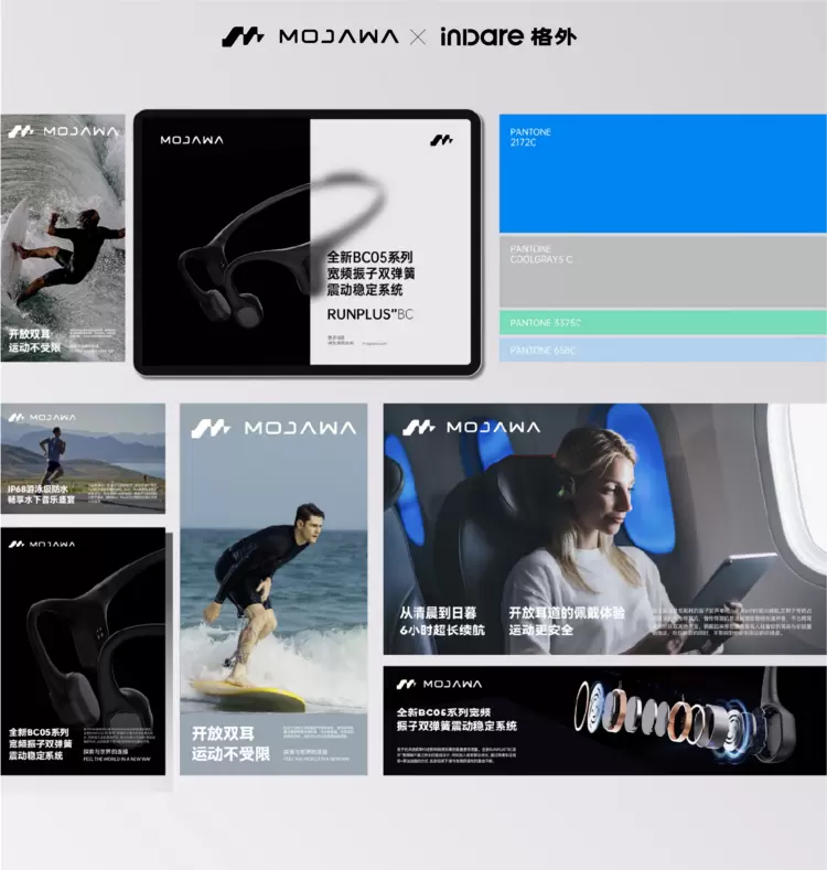 为直观表达产品形态,inDare 以宽频音震动时候产生的波段频率为视觉元素,组合成耳机轮廓;其次将IP68 级防水卖点优先展现,实现第一层客户信息沟通。