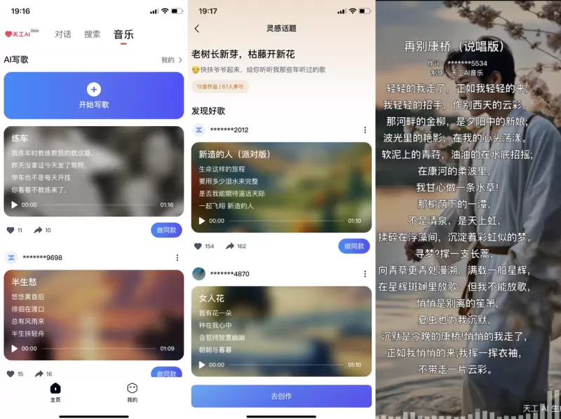 自开启邀测至今,短短几日内「天工SkyMusic」就成为用户二创神曲、改编古诗词、为朋友圈配乐等音乐创作的必备工具,甚至还大大拓宽各音乐平台内容创作的用户基础。