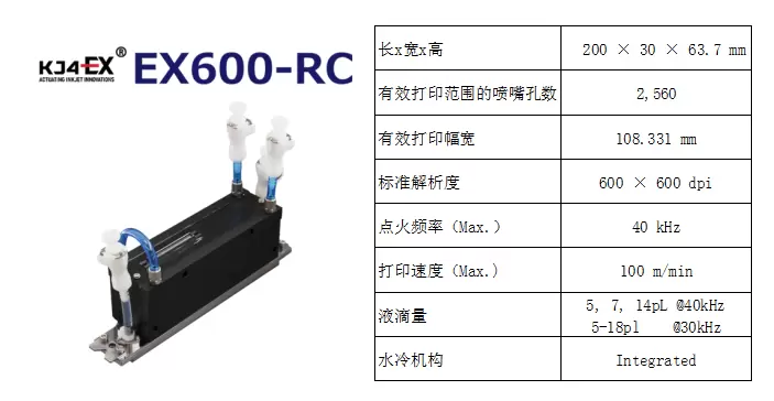 京瓷EX系列喷墨打印头的水性600dpi分别有EX600和EX600RC,其中EX600喷头与之前的QA喷头尺寸几乎一致,可与原有的产品互换。而EX600RC为循环喷头,打印速度可高达40kHz,且该喷头自带水冷夹,即使是在高Duty的连续印刷下也可以维持其稳定性。