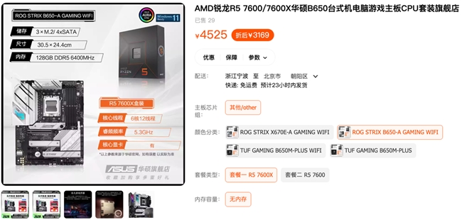 且天猫商城还有华硕B650吹雪主板搭R5 7600X处理器套包,折后价仅需3169元,可享3期免息福利。