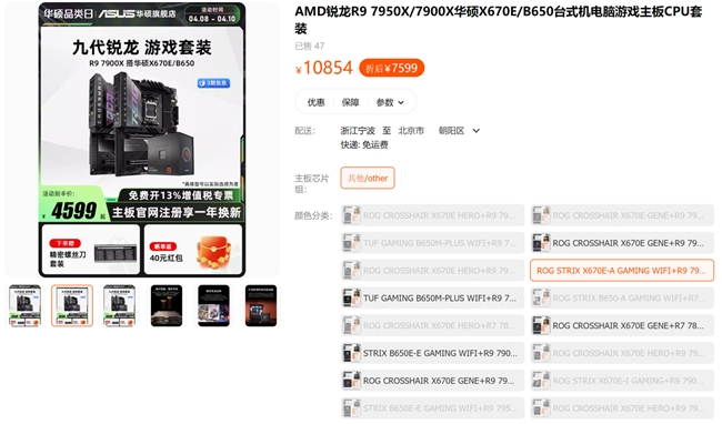 且天猫商城还有华硕X670E吹雪主板搭R9 7950X3D处理器套包,折后价7599元,可享3期免息福利,买就送精装螺丝刀套装。