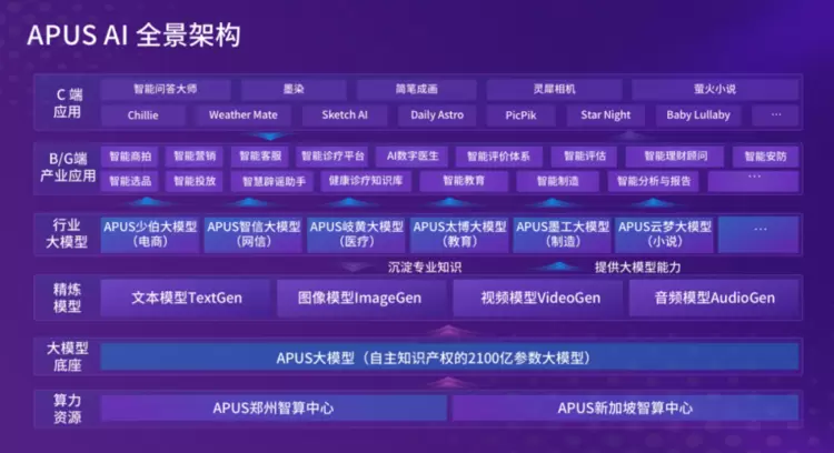 以APUS为例,自2014年创立以来,厚积薄发,步履未停,至今已推出200余款应用产品,涵盖工具、内容与服务等多个场景。2018年转型人工智能后,已推出萤火小说、智能问答大师、简笔成画、墨染等多款人工智能产品,并通过APUS大模型底座重构自身原生产品矩阵,以工具+AI,内容+AI,服务+AI三层应用为全线产品赋能,探索孵化用户端超级应用。