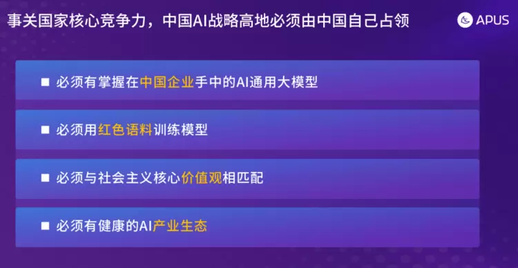 如今,AI大模型应用已走向产业纵深,中国科创企业尤其是人工智能企业承载着引领模型价值、推动务实创新的重任。APUS董事长兼CEO李涛认为,中国作为世界第二大经济体,必须要有掌握在中国企业手中的AI通用大模型;必须用红色语料训练模型;必须与社会主义核心价值观相匹配;必须有健康的AI产业生态。