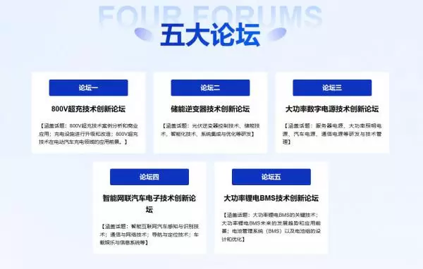 此外,本届电子峰会还设置有5个分论坛,涉及800V超充技术、光伏储能逆变器、大功率数字电源、智能网联汽车电子以及大功率锂电BMS等新能源领域。