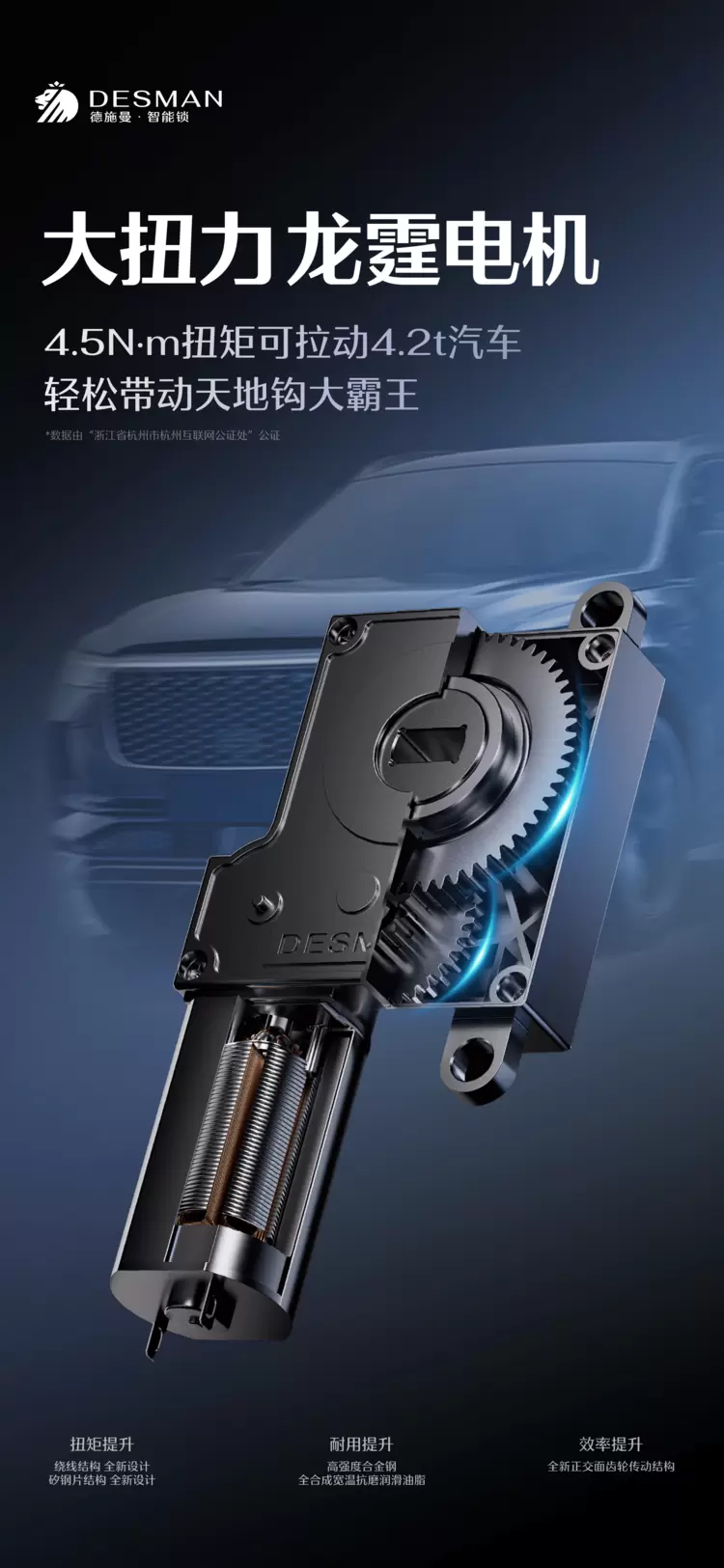德施曼针对中国门的属性,独家首创龙霆电机,扭矩高达4.5Nm,是传统大电机的1.68倍,内置小电机的10倍。经国家公证机构全程公证,德施曼龙霆电机强劲动力可拉动4.2吨大型汽车,具备超越智能锁电机的动力和稳定性,更配中国门。