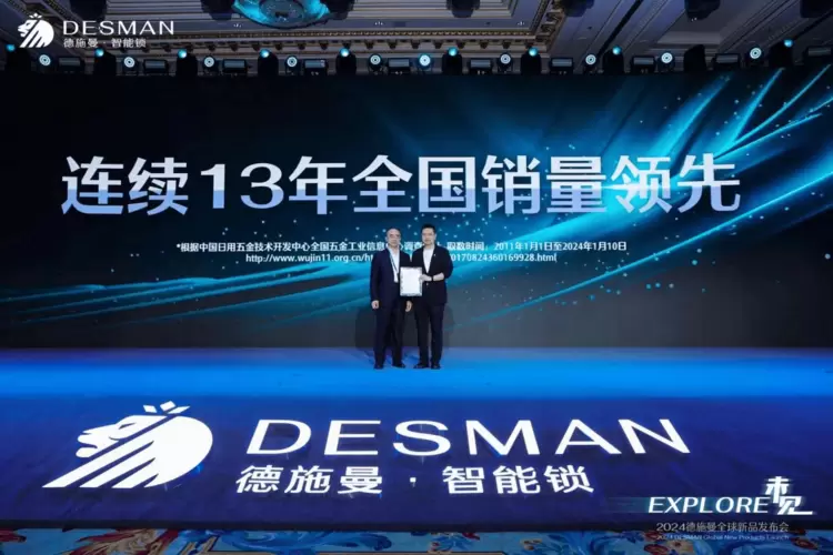 自2009年成立至今,德施曼智能锁走过十五年征程。大会现场,权威机构中国日用五金技术开发中心正式公布了最新统计数据,从线上线下以及经销体系等多个渠道的数据显示,德施曼智能锁已连续十三年全国销量领先。现场,中国日用五金技术开发中心副主任吴庆为德施曼颁发了“连续十三年全国销量领先”认证证书。