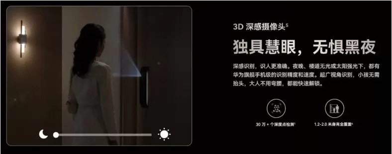 华为智能门锁 Plus还使用了华为旗舰手机(HUAWEI Mate 60)同款的3D深感摄像头。该摄像头使用了3D ToF(Time of Flight)技术,可捕捉高达307,200个人脸特征点,即使在强光、逆光、暗光等场景下都可以做到精准解锁。为了打造更自然、舒适的解锁体验,华为智能门锁 Plus的3D摄像头还采用了向上16°的倾角布置,覆盖角度为78°,能够识别1.2-2.0m的人体身高区间,让小孩子无需抬头,成年人也不用弯腰。