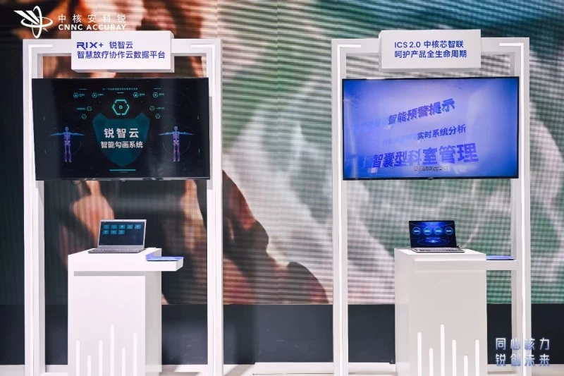 展会上,中核安科锐重点展示了其医工协同模式下自主研发的适合中国国情的两款数字化平台——锐智云RIX+、中核芯智联平台ICS 2.0。智慧放疗协作云数据平台锐智云RIX+是基于5G物联、云平台和AI人工智能技术联合打造的数字化平台,可实现全身100多个器官的靶区智能勾画;中核芯智联平台ICS 2.0可提供全方位的实时数据,监测设备运营状态,可以实时甚至预测设备状态,调度相应的技术和备件资源,第一时间响应客户的服务需求。两款软件均基于医院临床使用的实际需求而研发,解决医院在放射治疗流程中的痛点问题。