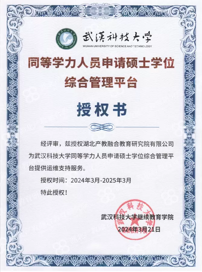 日前,经武汉科技大学各级领导、专家深入评审调研,确定采用“同等学力申硕综合服务平台”作为武汉科技大学继续教育学院培养同等学力申硕学员的官方教学平台,并授权湖北产教融合教育研究院全权负责该平台的运维支持工作。