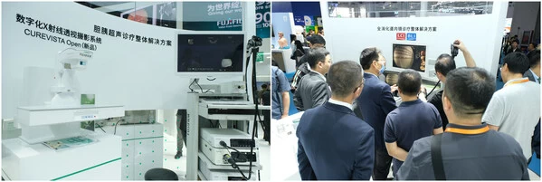 中国智造,也是此次展台的核心主题之一。富士胶片医疗立足中国市场,已推出多款国产化产品。本次展台上也是新品齐发、精彩纷呈。智慧影像融合区域带来了即将国产化的超声产品ARIETTA 750SE,该产品根据诊断超声市场的临床需求设计,旨在打造适用于不同临床学科的超声平台。而在呵护肠胃健康区域,全新国产数字化X射线透视摄影系统CUREVISTA Open首次亮相,这款系统将融入到胆胰超声内镜诊疗解决方案中,协助更高效、更安全地完成内镜下对于胆胰疾病的诊治,守护国民健康,富士胶片砥砺前行。除此之外,索诺声超声推出国产化主力机型PX(注册中)、Edge II、M-Turbo,打造面向中国市场的临床POC可视化解决方案。