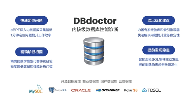 据调研数据库性能问题是DBA和架构师面临的首要痛点,传统数据库性能诊断基于告警驱动临时性强、难以精准定位根因,性能排查强依赖个人经验。由聚好看科技自主研发的数据库性能诊断产品DBdoctor针对以上问题创新性地利用eBPF技术透视数据库内核实现根因诊断,通过数学模型精准定位,打破基于经验、规则、阈值诊断的传统,真正实现单条SQL资源量化,把资源消耗映射为颜色面积,直观定位数据库性能问题并给出优化建议,真正做到事前发现隐患、事中精确诊断、事后随时追溯,实现数据库性能诊断百倍提效。