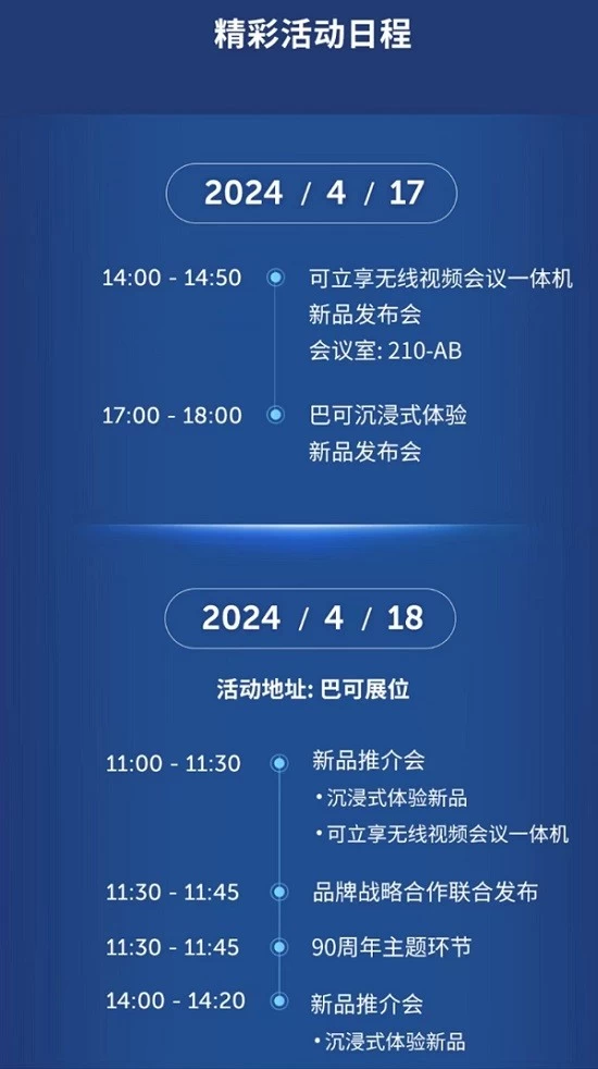 4月17日-4月18日,巴可将举行重磅新品发布会,在中国市场正式推出可立享无线视频会议一体机ClickShare Bar,邀请行业伙伴与客户一同感受高度集成化的创新设计,体验音视频AI技术,见证企业会议室轻松升级混合办公模式。其次展会期间在巴可展台更有多场沉浸式新品体验发布会等你来。
