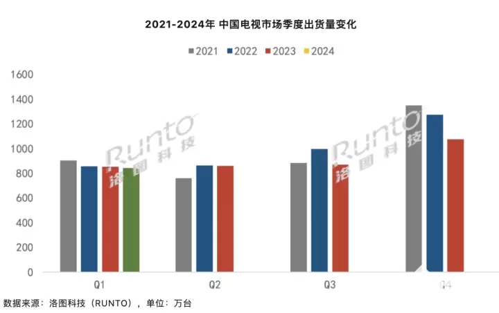 2024年第一季度,中国电视市场品牌整机出货量达到844万台,较2023年同期微幅下降0.9%。