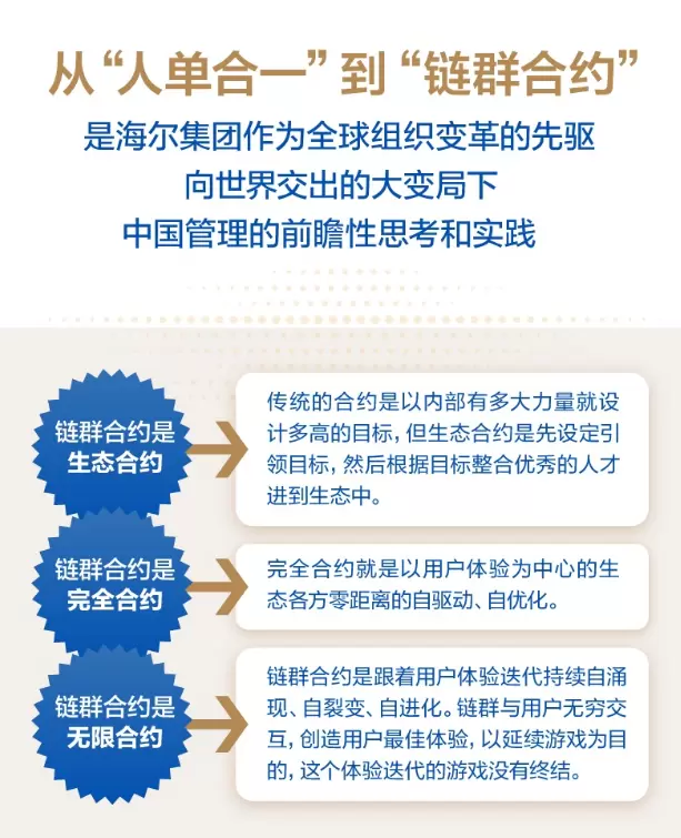 人类进入万物互联的物联网时代,加之生成式人工智能的快速崛起,组织需要更大的包容性、更强的韧性去激发工作中每个成员的激情与创造力,赋权并培育每位员工,实现其梦想和价值。海尔集团作为全球组织变革的先驱,通过“链群合约”的组织模式向世界交出了大变局下中国管理的前瞻性思考和实践——链群合约,我将其概括为组织实现“以人为本、数字赋能、动态寻优的内部创业机制”。