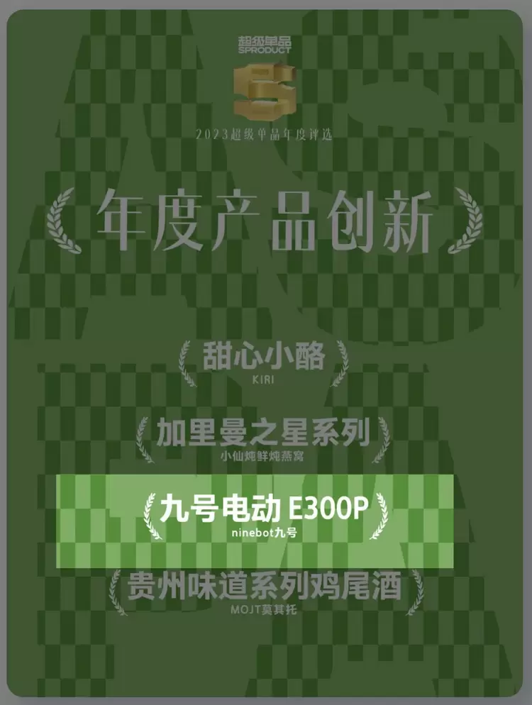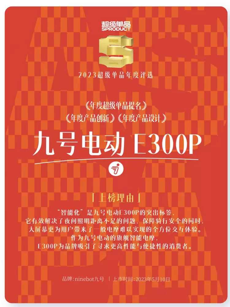 近日,2023超级单品年度评选隆重揭晓。其中,九号公司旗下智能电动两轮车九号电动E300P荣获“年度产品创新”、“年度产品设计”等三项大奖,并成为两轮出行领域业内唯一获此殊荣的品牌。此次斩获超级单品产品创新大奖奖,不仅印证了九号公司领先的品牌实力,更是其持续深耕科技出行领域的成果体现。
