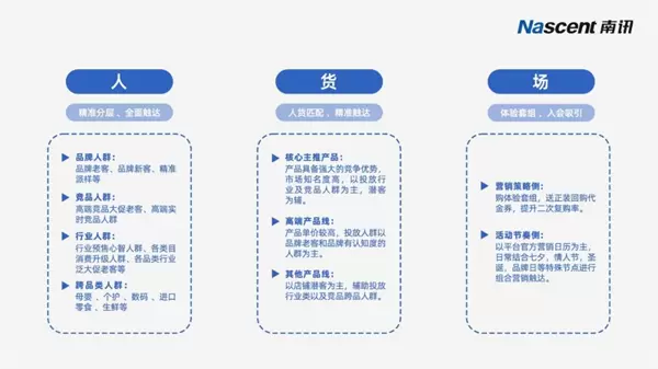 针对日常营销期、大促蓄水期、大促爆发期,品牌携手南讯,制定了整体营销思路。例如在大促爆发期,主要针对存量潜客以及蓄水期新转化的潜客人群进行二次营销,辅助新客营销,促成转化。并围绕“人货场”,制定了精细化的投放策略。
