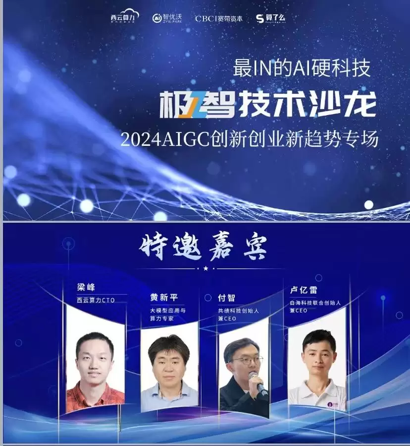 2024年4月14日,由西云算力、智优沃科技、宽带资本·AI坊和共绩科技联合举办的“极智技术沙龙-2024 AIGC 创新创业新趋势专场”成功举行。