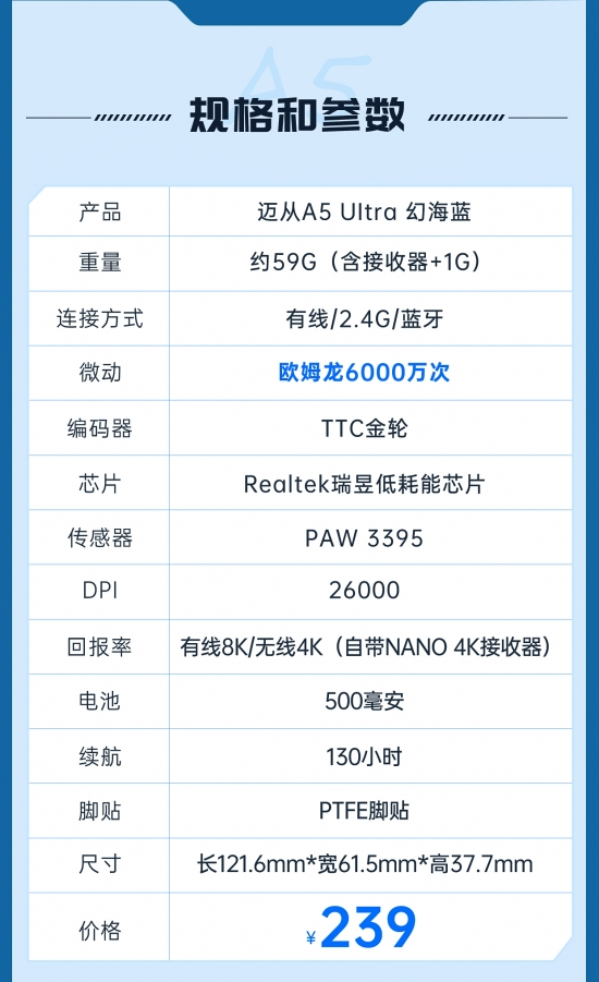 迈从官方发布A5鼠标Ultra版新色幻海蓝!新品将4月16日20点,在迈从京东、天猫、抖音全平台上架发售!A5Ultra版采用全新欧姆龙6000万次微动,配备ealtek瑞昱低耗能芯片,自带有线8K+NANO 4K接收器,更高颜值、功耗更低,稳定性更强!