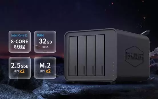 而我目前使用的是铁威马家2024年全新旗舰新作F4-424 Pro,采用i3八核八线程处理器,32 Gb DDR5内存,两个2.5G网口,内置两个M.2 NVMe 插槽,实现SSD 缓存加速,成倍提升磁盘阵列的存储效率,是个人和企业的高性能存储解决方案。
