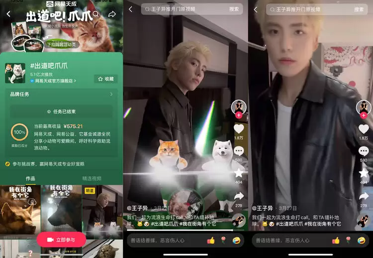 不止线下,网易天成还在线上发起“出道吧爪爪”抖音挑战赛,吸引超20万爱宠人士的积极参与,登上了抖音等多个社交媒体热搜,引发上亿人关注。作为“我在街角有个它”公益行动的生命守护大使,王子异发布视频参与,并倡议科学救助流浪动物。