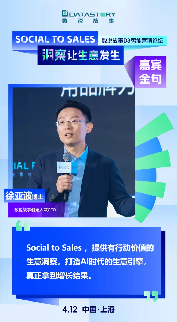 数说故事创始人兼CEO徐亚波博士于大会现场为我们带来了《Social to Sales,洞察让生意发生》的主题演讲,并重磅发布了数说故事2024年度全新战略。